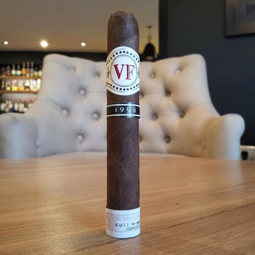 VF 1998 es la línea de cigarros añejados de Vegafina que conmemora, con su nombre, el año del nacimiento de la marca. Creada como su línea más premium, VF 1998 ofrece cigarros elaborados a mano con hojas de tabaco seleccionadas cuidadosamente y añejadas mínimo por 3 años. Un delicado proceso fruto del exhaustivo trabajo desarrollado por el Grupo de Maestros de Tabacalera de García, fábrica situada en la localidad dominicana de La Romana. Además de su anilla con nombre de la marca, el cigarro cuenta con un elegante cintillo negro con la fecha de nacimiento de la marca. Tripa de República Dominicana, Nicaragua y Colombia, Capote de Java Indonesia y Capa de Ecuador.
